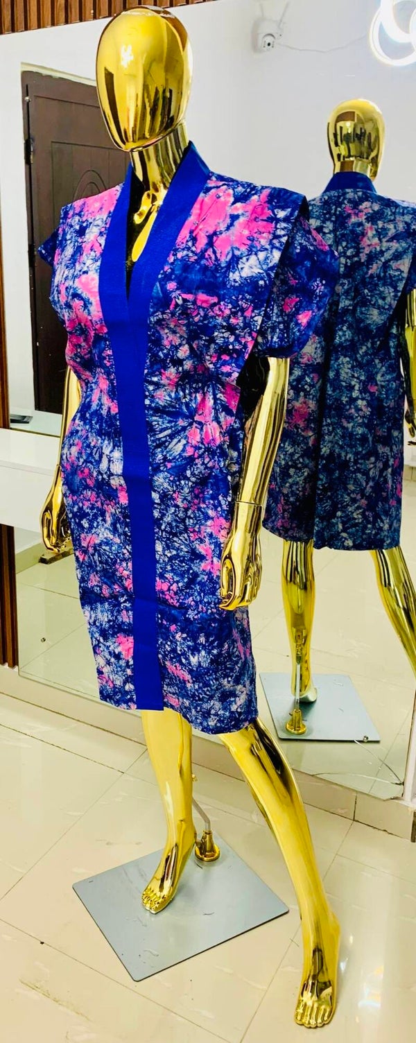 Fine cotton adire dress with inner waistline belt for a cinched waist.