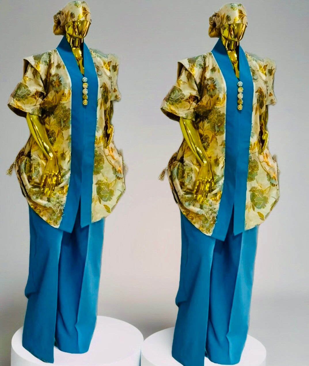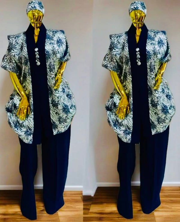 The Molly Brocade 3-Piece Trouser Set is a refined blend of African tradition and modern elegance. Made from high-quality European brocade, this set includes a beautifully tailored top, matching trousers, and a stylish scarf for a complete look.