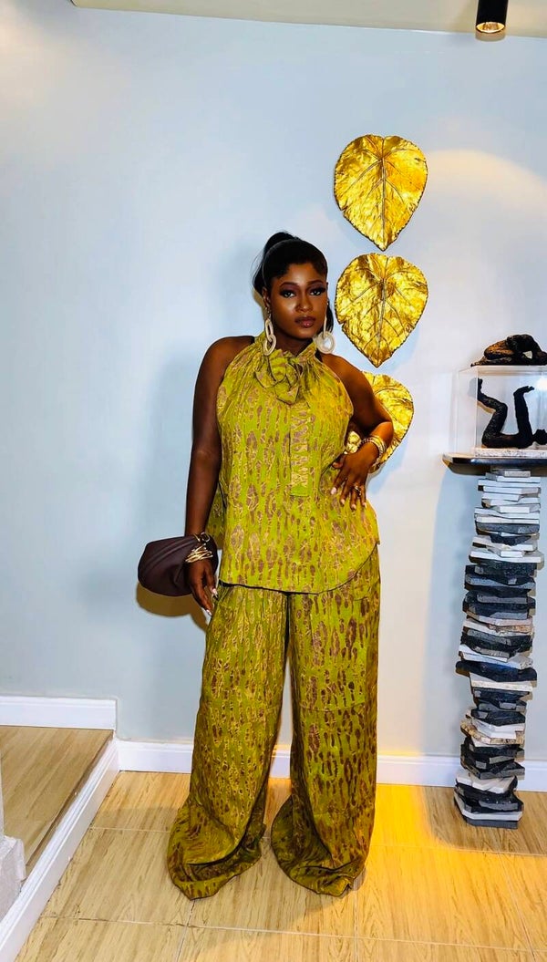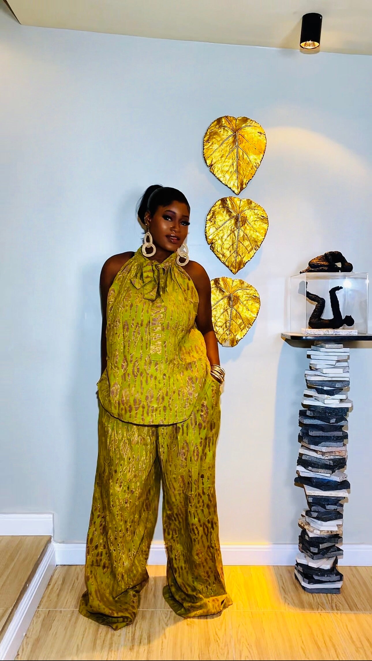 The Sapphire Adire Trouser Set features a stylish halter-neck Adire top paired with matching trousers, combining elegance with comfort. Handcrafted from high-quality cotton Adire fabric, this two-piece set is perfect for both casual outings and special occasions.