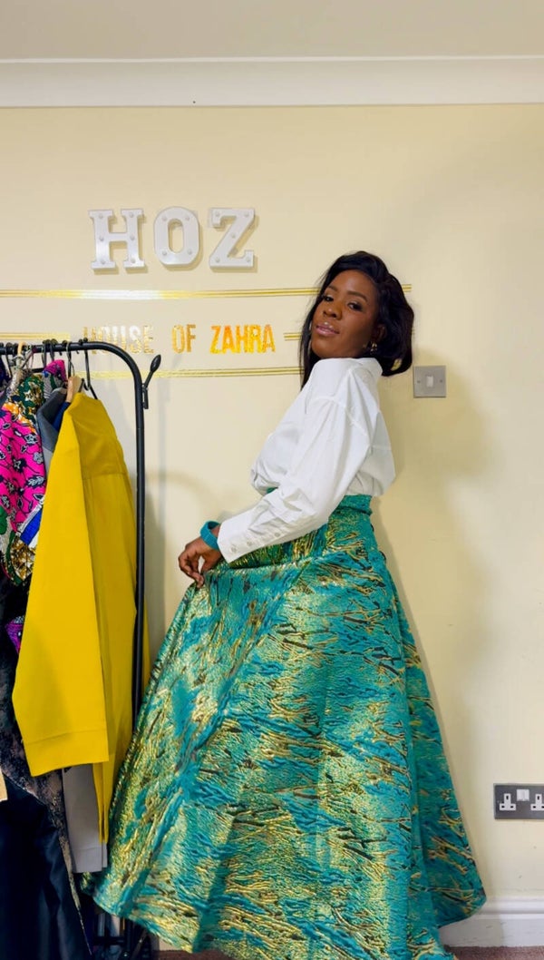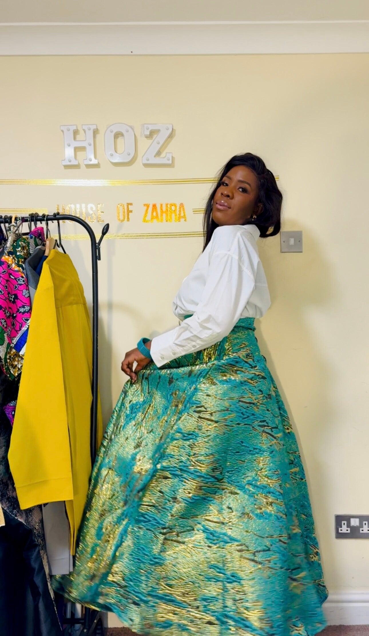 The elegant Nonye brocade skirt can be style into a drape skirt giving it a more sophisticated look.